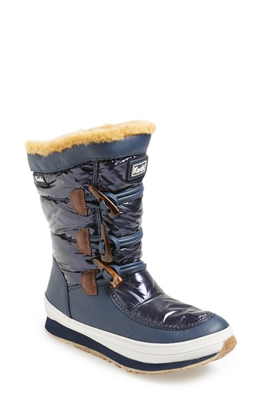 Face the winter chill fearlessly in these waterproof boots styled with toggle detailing. Foot-coddling features include a cozy faux-shearling lining, cushioned insole and lightweight, flexible sole. Color(s): black, black plaid, navy, white. Brand: Keds.
