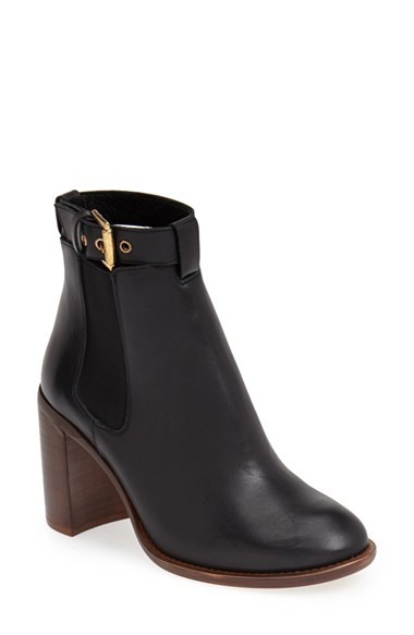Black and gold is the new black, and these booties deliver with an adjustable strap at the collar styled with goldtone hardware. A stacked block heel and rounded toe finish off the trend-right look. Color(s): black. Brand: KG by KURT GEIGER. Style Name: K