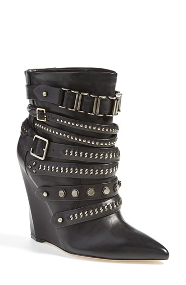 Flaunt your rocker edge with this pointy-toe boot, set apart with a so-sleek tapered wedge and draped with heavy-metal hardware. Color(s): black. Brand: L.A.M.B. Style Name: L.A.M.B. 'Thacker' Wedge Boot (Women). Style Number: 733789.