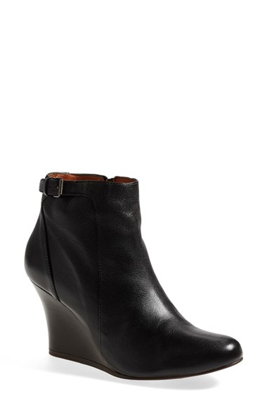 A simplified buckle strap brings understated elegance to an indispensable ankle bootie set on a streamlined wedge. Color(s): black, dark brown. Brand: LANVIN. Style Name: Lanvin Wedge Ankle Bootie (Women). Style Number: 749747.