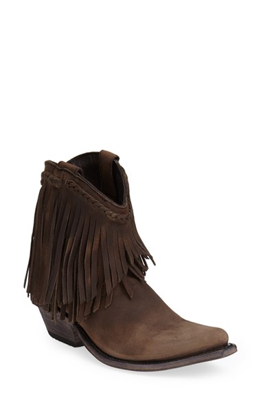 Bold fringe and braided trim extend the Western appeal of a stacked-heel ankle boot fashioned from lightly distressed leather. Color(s): blue, smog. Brand: LIBERTY BLACK. Style Name: Liberty Black Fringe Bootie (Women). Style Number: 874388.