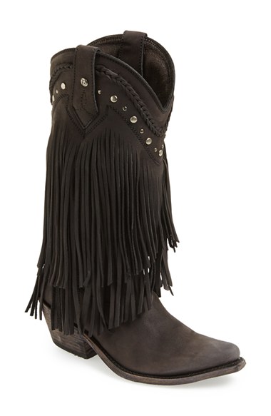 Antiqued studs and dramatic fringe underscore the authentic style of a stacked-heel Western boot fashioned from strategically distressed leather. Color(s): black, brown. Brand: LIBERTY BLACK. Style Name: Liberty Black Tall Fringe Boot (Women). Style Numbe