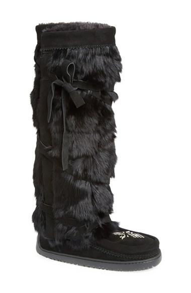 Genuine rabbit fur lends an ultra-plush touch to a handcrafted suede boot finished with an intricate hand-beaded design that reflects Aboriginal customs and culture. A sturdy Vibram rubber sole provides sure-footed traction. Color(s): black, charcoal. Brand: Manitobah Mukluks. Style Name: Manitobah Mukluks Genuine Rabbit Fur Tall Wrap Boot (Women). Style Number: 797099.
