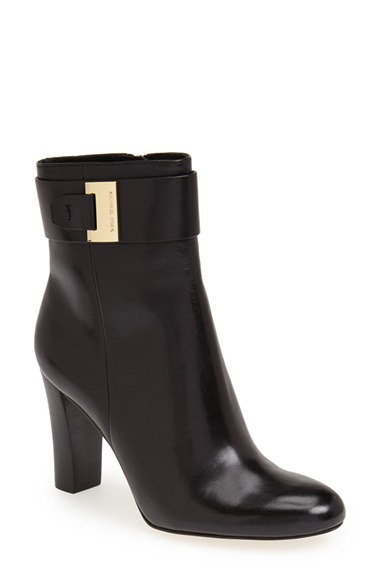 A gleaming goldtone buckle offers chic style on an essential leather ankle bootie lifted by a stacked heel. Color(s): black, dark chocolate. Brand: MICHAEL Michael Kors. Style Name: MICHAEL Michael Kors 'Guiliana' Leather Bootie (Women). Style N