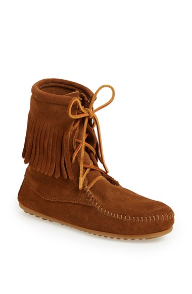 Handcrafted fringe adds to the woodsy charm of a moc-inspired bootie with a nubby rubber sole and rawhide laces. Color(s): dusty brown, grey, taupe. Brand: Minnetonka. Style Name: Minnetonka 'Tramper' Fringed Suede Ankle Bootie. Style Number: 430970.