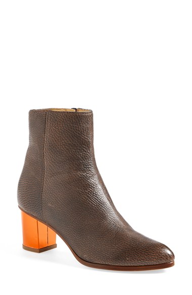 A gilt metallic heel gives eye-catching lift to an Italian-crafted leather boot with a streamlined, almond-toe silhouette. Color(s): brown/ orange. Brand: MM6 MAISON MARTIN MARGIELA. Style Name: MM6 Maison Martin Margiela Leather Bootie. Style Number: 753