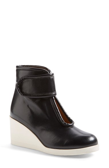 A mid-heel bootie is lightened up with a deeply cut, peekaboo vamp and a bright white wedge. Soft and supple nappa leather teams up with an adjustable ankle tab to offer a smooth, custom-feel fit. Color(s): black. Brand: MM6 MAISON MARTIN MARGIELA. Style Name: MM6 Maison Martin Margiela Nappa Leather Wedge Bootie (Women). Style Number: 867428.