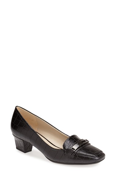 A gleaming goldtone buckle details a classic pump with loafer-inspired styling. A low, sculpted heel and signature N5 cushioning system make for all-day comfort. Color(s): black croco. Brand: Naturalizer. Style Name: Naturalizer 'Flynn' Leather