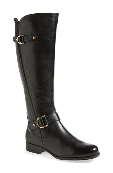 Antiqued hardware trims the belted shaft of a lightly textured leather riding boot that's built with signature N5 technology for lasting comfort. An angled elastic inset down the side and an elastic panel at the calf perfect the fit. Color(s): black