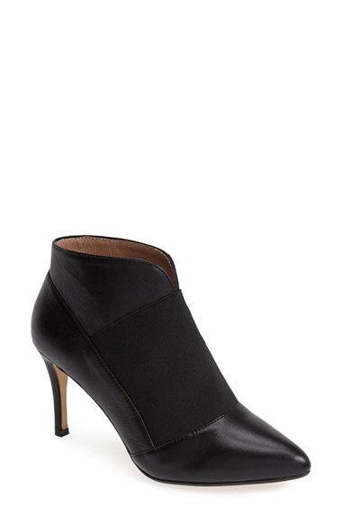A stretchy vamp ensures a custom fit on a pointy-toe leather boot set on a slender stiletto heel. Color(s): black leather, black patent. Brand: NINA ORIGINALS. Style Name: Nina Originals 'Action' Leather Bootie (Women). Style Number: 846579.