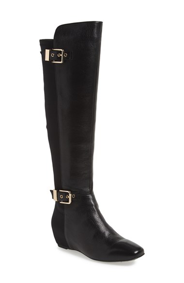 Stretchy neoprene shapes the back of a hidden-wedge boot cut from tumbled leather and accented with glints of goldtone hardware. Color(s): black, coffee. Brand: NINA ORIGINALS. Style Name: Nina Originals 'Floriane' Leather Over the Knee Stretch Boot (Women). Style Number: 829235.