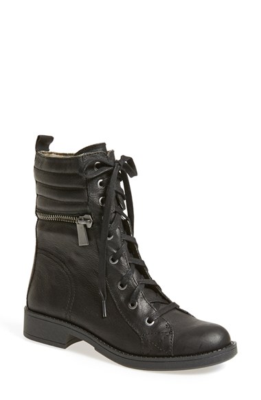 Sleek zipper trim and a channel-quilted cuff extend the moto edge of a lace-up leather bootie. Color(s): black leather, cognac leather. Brand: Nine West. Style Name: Nine West 'Ferocity' Moto Bootie (Women). Style Number: 830329.