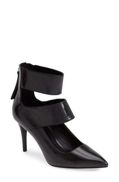 A duo of bold straps tops a striking leather pump set on a slender stiletto heel. Color(s): black/ black. Brand: Nine West. Style Name: Nine West 'Pursue' Leather Pump (Women). Style Number: 817957.