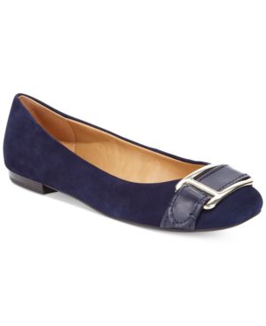 A bold buckle dresses up this tailored style by Nine West. The Sissy ballet flats feature a slightly squared toe and smooth suede finish.