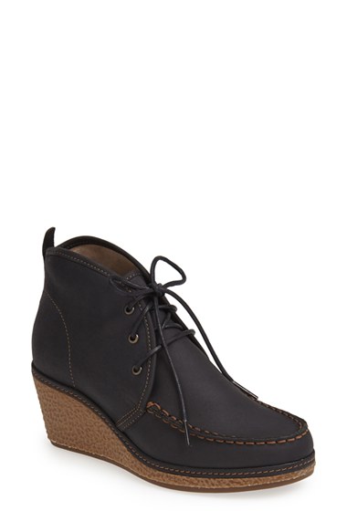 A moc-stitched toe and hand-stitched accents distinguish an oiled-leather bootie lifted by a textured wedge heel and platform. A dual-density midsole adds flexibility and stability, and a non-marking rubber sole offers excellent traction. Color(s): black/ tan, tobacco. Brand: Olukai. Style Name: OluKai 'Wali' Wedge Bootie (Women). Style Number: 470692.