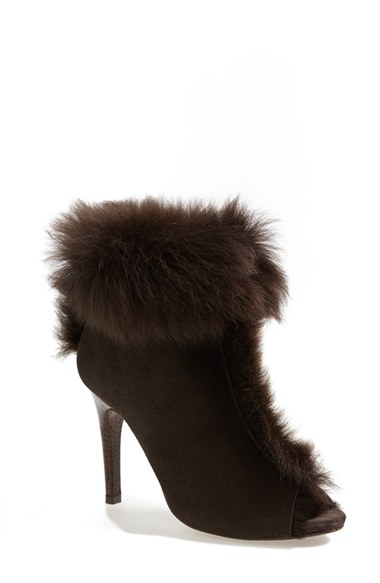 Lush shearling trim styles the fold-over cuff and peep toe of an impeccably crafted stacked-heel bootie. Color(s): silt. Brand: PEDRO GARCIA. Style Name: Pedro Garcia 'Saskya' Genuine Shearling & Leather Bootie (Women). Style Number: 483475.