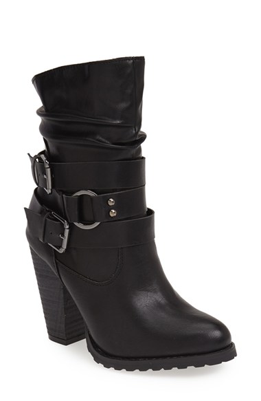 Blend the trends in a stacked-heel boot that's a seamless fusion of moto style and rustic, Western edge. Bunches of belts and a lugged sole represent the biker vibe, while the stacked heel and slouched shaft kick up the cowgirl look. Color(s): black,