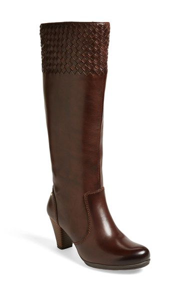 A woven cuff lends a touch of textural intrigue to an essential knee-high boot cast in burnished leather with a sleek stacked heel. Color(s): olmo. Brand: Pikolinos. Style Name: PIKOLINOS 'Verona' Tall Boot (Women). Style Number: 753471.