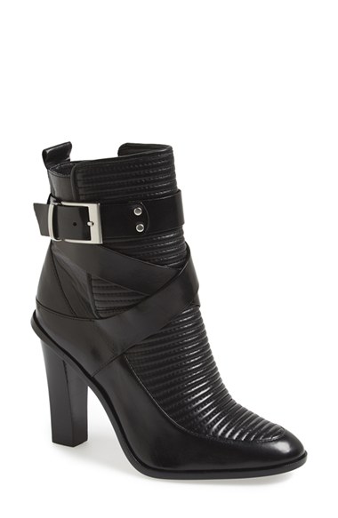Add a twist of the moto trend to your look with Rachel Zoe's toughened-up take on the ankle bootie. The channel-stitched vamp and buckle strap combine to biker effect, while slender straps wrap and flatter the ankle. Color(s): black. Brand: Rachel Zo