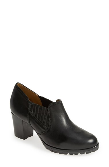 A sleek leather bootie with a low profile is set on a stylish stacked heel and features stretchy side panels for a custom fit. Color(s): black, vintage leather. Brand: Robert Zur. Style Name: Robert Zur 'Lorri' Leather Bootie (Women). Style Numb