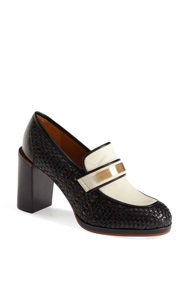 The signature See by Chloe heel is a smart start to the Twila loafer pump, a round-toe style that gets a bit of breathing room from its woven leather design. A contrast vamp and bold, golden hardware provide a standout signoff. Color(s): black. Brand: See