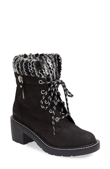 A heavily lugged sole and decorative zip detail lend a touch of biker attitude to a casual-cool lace-up boot topped with a cozy knit cuff. Color(s): black leather. Brand: Shellys London. Style Name: Shellys London 'Colao' Boot (Women). Style Num
