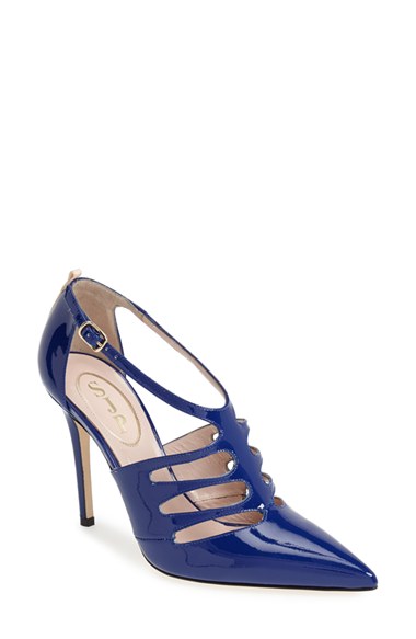 This sophisticated, patent-leather T-strap pump offers a hint of edgy glamour with striking, rib cage-inspired cutouts detailing the vamp and a forever-classic pointy-toe silhouette. A bit of delicate grosgrain ribbon trim pays tribute to designer Sarah Jessica Parker's favorite childhood adornment while providing a signature finishing touch. Color(s): cobalt patent. Brand: SJP. Style Name: SJP 'Denise' Patent Leather T-Strap Pump (Women). Style Number: 849985.