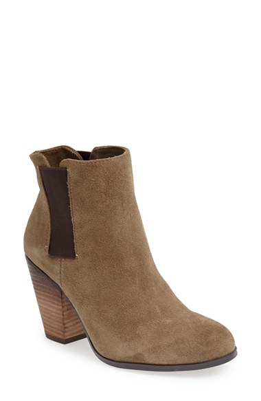 Classic Western style gets an urban kick with these soft suede booties that feature a curved top line and stacked heel. The elastic side bands ensure all-day comfort when you're hoofing it. Color(s): army/ dark brown, black, smoke taupe/ dark brown.