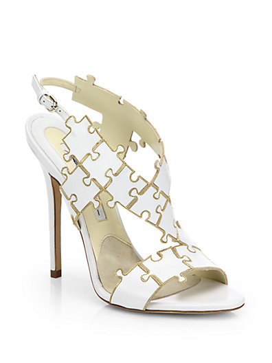Find the missing piece to your wardrobe with these unique sky-high sandals constructed from leather puzzle pieces framed with a delicate metal chain. ;Self-covered heel, 5" (125mm) ;Leather upper; Adjustable slingback strap; Leather lining and sole; Padded insole; Made in Italy