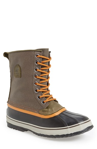 A waterproof waxed canvas upper provides rainy-day protection to a classic lace-up boot with a durable rubber sole. Color(s): black/ dark green, black/ sautrene, charcoal/ black, goat/ dark olive, peatmoss. Brand: Sorel. Style Name: Sorel '1964 Premi