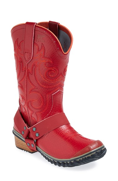 A tooled, grainy shaft details a Western-inspired boot wrapped with low-slung harness straps and set on a handcrafted herringbone-tread rubber sole and a stacked woodgrain heel. Color(s): black, chili red, grizzly bear, peatmoss. Brand: Sorel. Style Name: SOREL 'Slimwestern' Waterproof Boot (Women). Style Number: 701189.