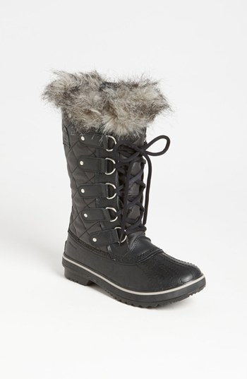 A lightweight quilted upper is made of waterproof waxed canvas with a durable leather shell and topped with a fab faux-fur collar. A molded rubber outsole echoes the classic 1964 Pac boot and provides superb traction in slippery slush and snow. Color(s): black canvas, black glitter, black/ white/ plaid, blue, cordovan, grizzly bear, kettle corange, nori/ deep blush, quarry/ cloudburst. Brand: Sorel. Style Name: SOREL 'Tofino' Boot. Style Number: 362505.