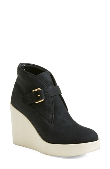 A smooth, streamlined upper lends sophistication to a gorgeous bootie elevated by a sturdy wedge. Color(s): black. Brand: Stella McCartney. Style Name: Stella McCartney Monk Strap Wedge Bootie (Women). Style Number: 834337.