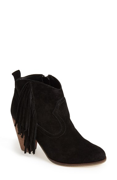Lush fringe lends Western attitude to an essential suede bootie set on a trend-right stacked heel. Color(s): taupe suede. Brand: Steve Madden. Style Name: Steve Madden 'Ponncho' Suede Bootie (Women). Style Number: 894120.