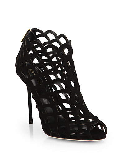 EXCLUSIVELY AT SAKS IN LIMONE. Geometric cutouts hint to the artistic aesthetic of Giuseppe Zanotti in an ultra-high suede silhouette.;Self-covered heel, 4.75" (120mm);Suede upper;Open toe;Back zip;Leather lining and sole;Padded insole;Made in Italy