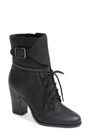 With its adjustable, buckled wraparound panel, eye-catching zipper detail and chunky stacked heel, the Farah bootie hits fall's fashion marks in superior style. Color(s): black, brown. Brand: T Tahari. Style Name: T Tahari 'Farah' Leather Bootie (Women). Style Number: 817432.