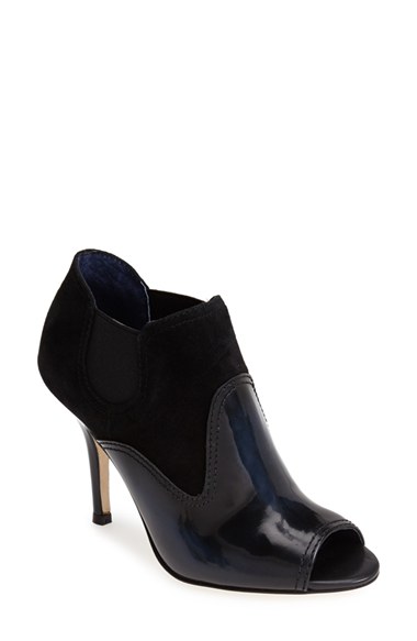 A modern mix of textures adds to the sleek sophistication of this impeccably crafted open-toe bootie. Color(s): blue/ black. Brand: T Tahari. Style Name: T Tahari 'Linda' Leather Bootie (Women). Style Number: 817438.
