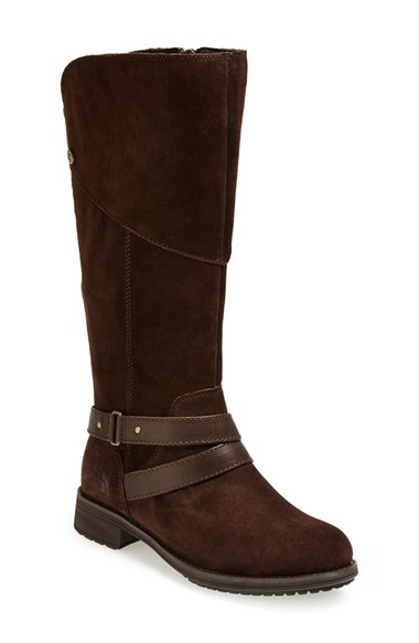 Equestrian style meets winter-ready warmth in a velvety waterproof-suede boot warmed with 200g Heatseeker insulation and fitted with a tonal elastic panel in back. A quilted Dri-Lex lining wicks away moisture as the lugged sole provides superior cold-weather traction. Color(s): black/ red, demitasse brown. Brand: The North Face. Style Name: The North Face 'Bridgeton' Waterproof Heatseeker Insulated Riding Boot (Women). Style Number: 482147.