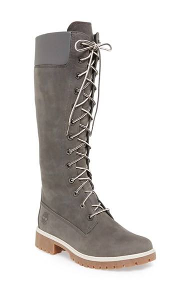 A striking knee-high silhouette lends a feminine update for a classic workwear boot designed with Timberland Earthkeepers' eco-conscious philosophy and constructed using sustainable, recycled materials. Color(s): black, dark grey, wheat. Brand: Timbe