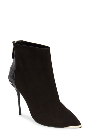 Signature hardware and snake-embossed leather add alluring style to a suede bootie set on a skinny stiletto heel. Color(s): black. Brand: TOPSHOP. Style Name: Topshop by CJG 'Access All Areas' Suede Bootie (Women). Style Number: 886713.
