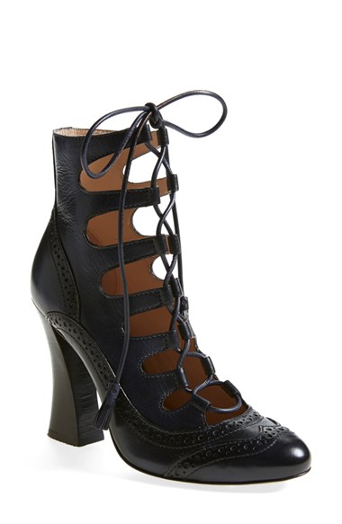 Brogued detailing and a flared heel lend a fabulous retro vibe to a chic caged bootie with a lace-up front. Known for rich color, bold prints and clean, graphic lines, Tory Burch designs have been making a splash since the brand debuted in 2004-always emb