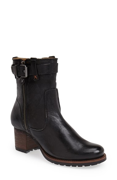 A boot with a been-there, done-that vibe features a distressed leather upper and block heel, adjustable buckled harness strap at the collar and dual zipper entry. A tough lug sole ensures a lot of mileage in the years to come. Color(s): black. Brand: TRASK. Style Name: Trask ' Madison' Distressed Leather Boot (Women). Style Number: 865782 1.