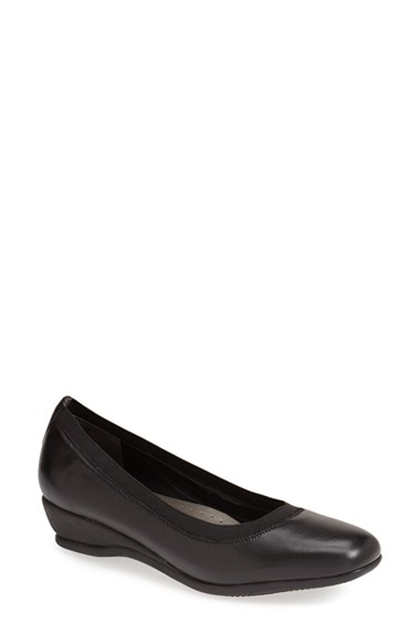 A cleanly styled pump crafted with an elastic topline for a comfortable fit gets lifted by a demure wedge heel. A flexible sole and padded footbed provide all-day wearability. Color(s): black leather, black lizard, black suede, brown suede, navy suede. Br