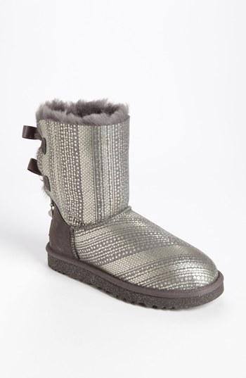 Swarovski crystal charms twinkle from the bows that march down the back of an iconic boot prettied up with a shimmery metallic print. The soft, cozy lining is made from genuine shearling with a plush UGGpure footbed to keep feet warm and comfortable. UGGpure is a moisture-wicking textile made entirely from wool but crafted to feel and wear like genuine shearling. Color(s): black, grey, white. Brand: UGG Australia. Style Name: UGG Australia 'Bailey Bow Bling' Boot (Women). Style Number: 673662.