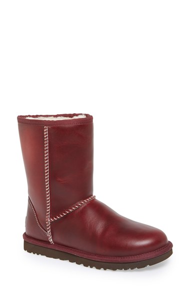 Contrast topstitching highlights the raised seams of a classic boot updated in smooth, water-resistant leather. The soft, cozy lining is made from genuine shearling or plush UGGpure, a textile made entirely from wool but engineered to feel and wear like genuine shearling. Either version keeps feet warm and comfortable, whatever the weather. Color(s): chestnut, peacoat. Brand: UGG Australia. Style Name: UGG Australia 'Classic Short' Water Resistant Boot (Women). Style Number: 813180.