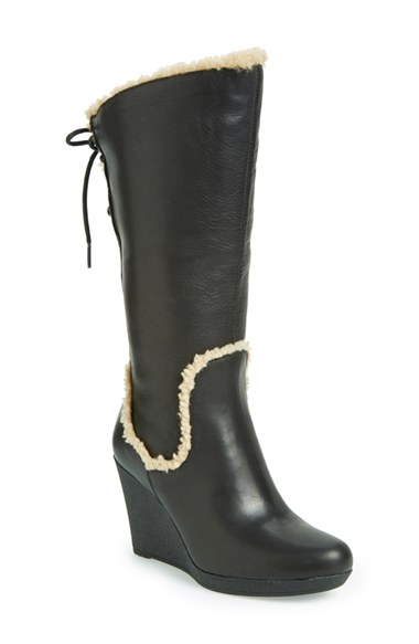 A corset-closed shaft and exposed sheepskin add sophistication to a chic leather boot set on a supportive wedge heel. The soft, cozy lining is made from genuine shearling with a plush UGGpure footbed to keep feet warm and comfortable. UGGpure is a moistur