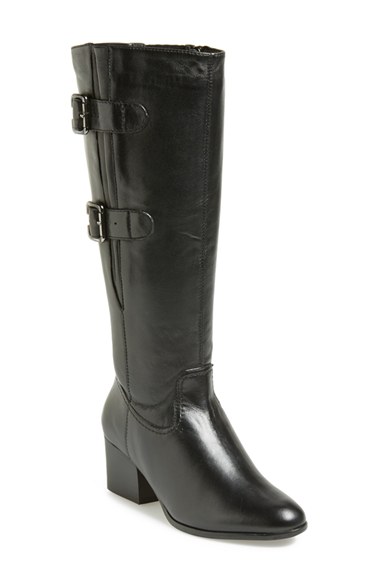 Dual adjustable buckles and a hidden elastic gore customize the fit of a sleek, block-heel riding boot crafted from supple leather. A padded insole and lightly cushioned lining provide lasting comfort. Color(s): black nappa. Brand: VANELi. Style Name: VANELi 'Catrin' Leather Knee High Boot (Women). Style Number: 754068.