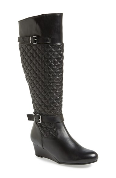 Dual buckle straps accentuate the quilted shaft of a downtown-chic boot set on a suave wedge heel. Color(s): black nappa/ gunmetal buckle. Brand: VANELi. Style Name: VANELi 'Lainey' Quilted Leather Boot (Women). Style Number: 819525.