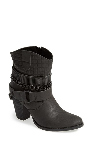 Studded straps and chains wrap the shaft of a quilted Western boot set on a chunky stacked heel. Color(s): black. Brand: Very Volatile. Style Name: Very Volatile 'Amplify' Western Boot (Women). Style Number: 798377.