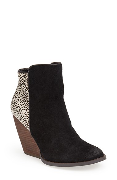 A speckled horsehair inset adds interest to a Western-influenced suede bootie lifted by a stacked demi-wedge with a woodgrained finish. Color(s): black multi. Brand: Very Volatile. Style Name: Very Volatile 'Chatter' Bootie (Women). Style Number: 798423.
